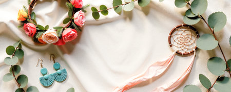 A vibrant floral wreath made of pink roses is placed alongside a dreamcatcher, with teal earrings nearby. Greenery complements the soft fabric background, creating an inviting display.