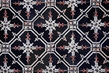 Fragment of a facade decorated with black and white tiles of azulejo. 31, street de Sao Vicente, Lisbon, Portugal
