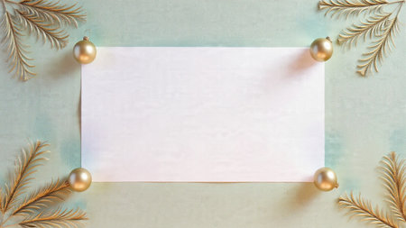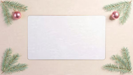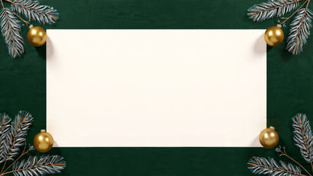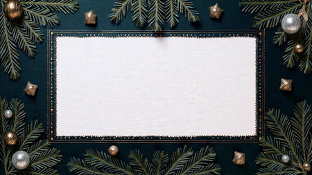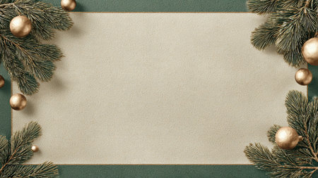 Green pine branches decorated with gold spheres and silver sparkles lining the left and right edges of a white center.