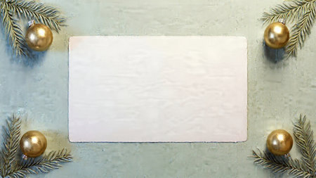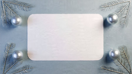 Christmas mocap, background with spruce balls and snowflakes and spruce branches , blank sheet of white paper, winter holidays concept, banner