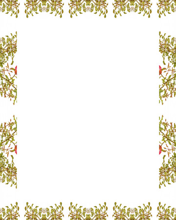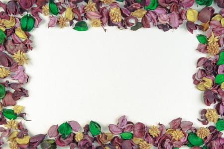 Dried flowers and leaves composition frame on white background. Top view, flat lay. Copy space for text or image