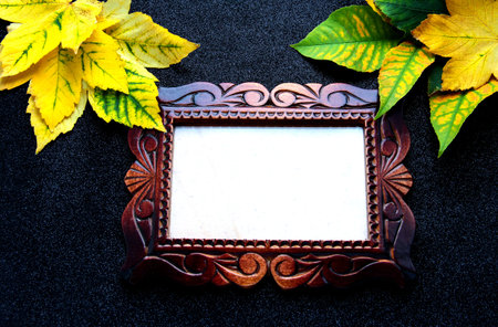 Wooden carved frame on a black background with autumn foliage.