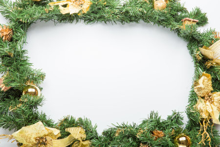 Elegant symmetrical pine frame decorated with festive metallic elements.