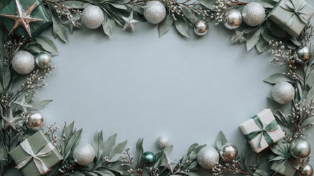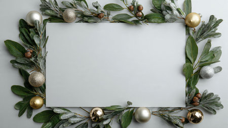Bright and balanced Christmas frame featuring deep green foliage and glittering decorations.