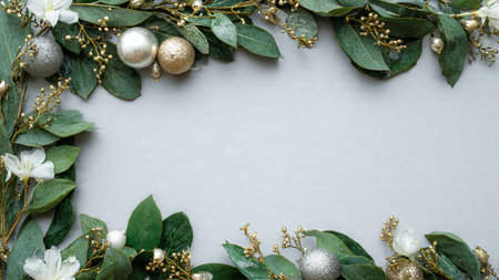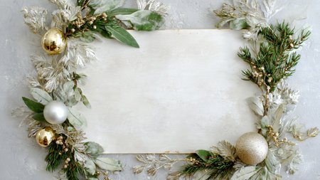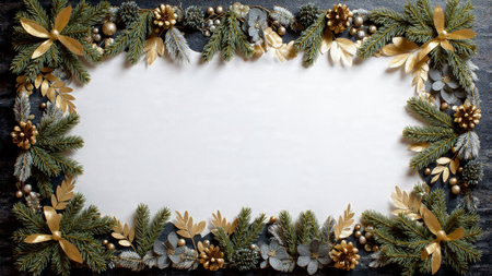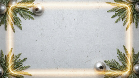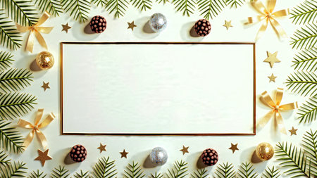 A soft, bright holiday frame enriched with pine and metallic details arranged neatly along the edges.