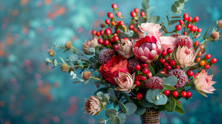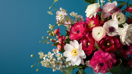 AI Generated. A bouquet of colorful flowers placed on a bright blue surface