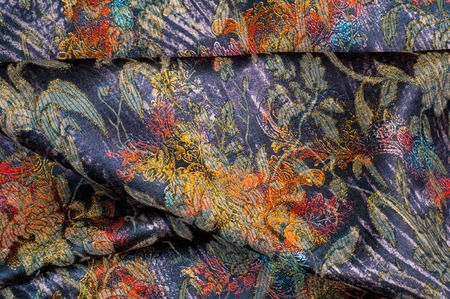 Texture, background, pattern. Silk fabric of black color with a paisley pattern.