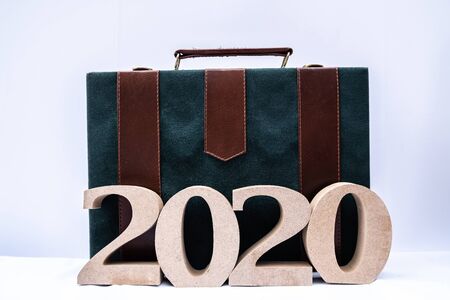 2020 wooden character infront of business bag, set new business goals with New Year 2020.