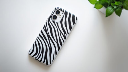 Flat lay of a zebra print phone case in vibrant black and white on white background showcasing modern style. concept of animal print fashion accessory, stylish phone protection, trendy design.