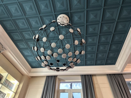 Geometric chandelier hanging from teal coffered ceiling in modern room. Symmetry, design, and interior architectural detail.