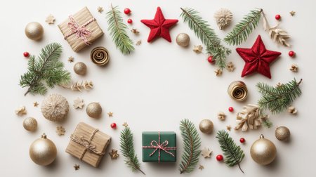 A beautiful flat lay of Christmas decorations including pine branches, red stars, golden baubles, and wrapped gifts arranged in a wreath shape on a white background.