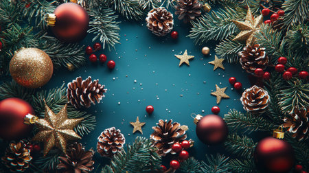A festive Christmas scene featuring pinecones, red and gold ornaments, and glittering stars arranged on a teal background with holiday accents.