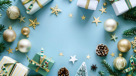 A festive Christmas background with elegant gifts and ornaments in gold and silver tones on a light blue background.
