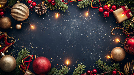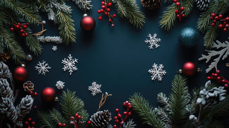 Christmas decorations such as snowflakes, baubles, and pine branches arranged on a dark background, perfect for holiday greetings