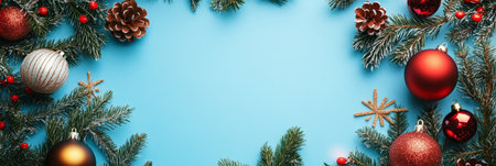 Festive red baubles, gold stars, and green pine branches arranged on a blue background, creating a holiday atmosphere.