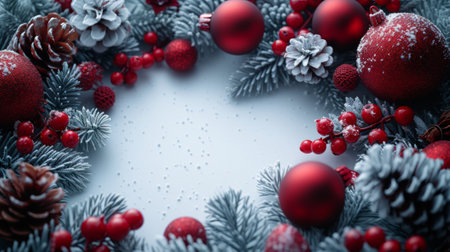 A stunning arrangement of festive Christmas ornaments and greenery on a rich red background, perfect for conveying holiday spirit and joy during the season.