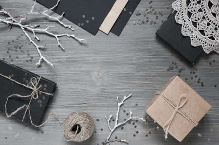 Christmas yellow handmade gift boxes on black background top view. Merry Christmas frame. Winter xmas holiday theme. Happy New Year. Flat lay.