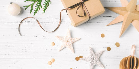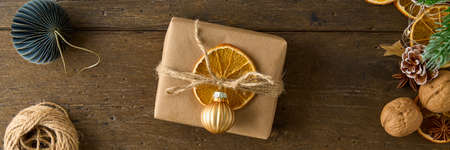 Christmas present in box. Eco friendly set. Zero Waste Ney Year Space for your greetings. Banner