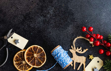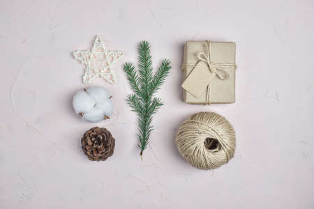 Zero waste Christmas, concept flat layout on gray plaster. Hand crafted gifts with natural Christmas decorations without plastic.