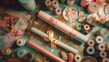 An elegant arrangement of gift wrapping items including paper, ribbons, and decorative accents, offering space for custom messages.