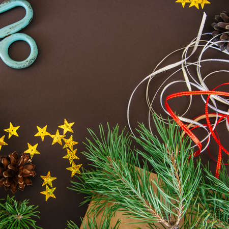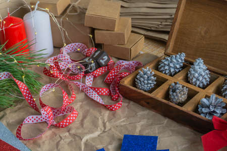 Preparation for Christmas, craft boxes for the Advent calendar, cones, red and white ribbon, pine branch, candles on the table on craft paper.