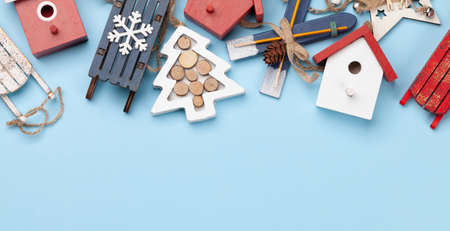 Top view Banner of holiday toys and decorations on blue Christmas background. New Year time concept.
