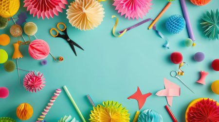 A table decorated with paper flowers, craft supplies, and colorful textiles in shades of green, azure, orange, yellow, and aqua. The vibrant electric blue patterns add an artistic touch AIG50
