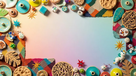 A vibrant border of colorful craft supplies including beads, buttons, fabric, and ceramic pieces, surrounding a bright gradient copy space.