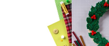 DIY instruction. Making a Christmas wreath from felt. Craft tools and supplies. Banner with space for text.