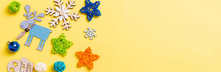 Top view of yellow background with New Year toys and decorations. Christmas time Banner concept with copy space.