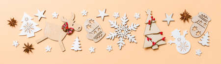 Banner Festive decorations and toys on orange background. Merry Christmas concept with copy space.