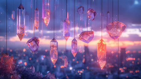 Diverse Crystals Hanging with a Modern City Skyline at Twilight.