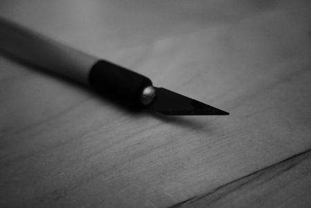 A closeup photo of cutter with scratches from use , Focused on a sharp blade