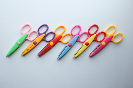 Set of utility knives and box cutters of different colors lying on a wooden surface. Concept of construction tools, office equipment, and DIY crafts