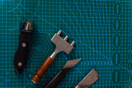 Craftsman leatherworking desk with tools for cutting, stitching, and carving. Leathercraft hand tools on cutting mat. Leathercraft tools including knives, chisels, and cutters for artisan crafting
