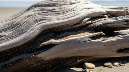 Macro shot of a piece of aged, weathered driftwood on a beach, showing fine sand in its cracks and a beautiful wood grain texture. AI generated