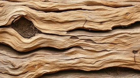 This image showcases a detailed close-up of aged wood, revealing complex textures and organic shapes. The natural color palette features various shades of brown and beige, highlighted by the intricate grain patterns. It suggests a sense of age and natural decay. Ideal for illustrating concepts related to nature and design elements in commercial projects.