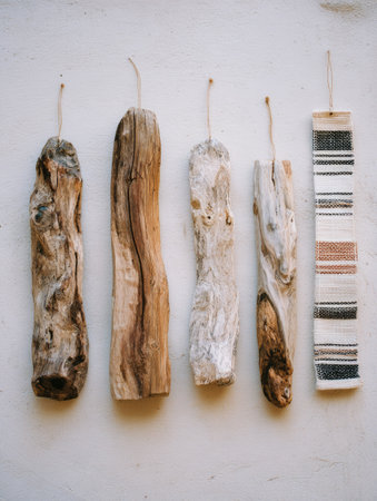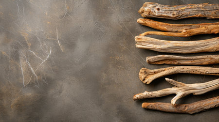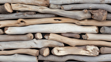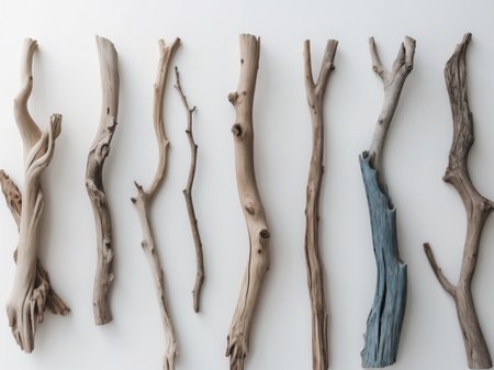 Natural driftwood sticks showcasing unique textures and colors arranged for creative display.