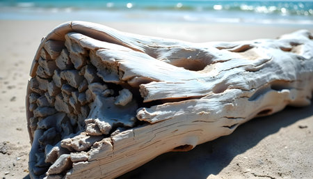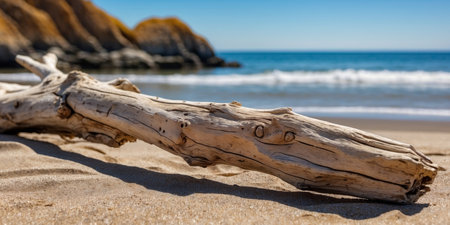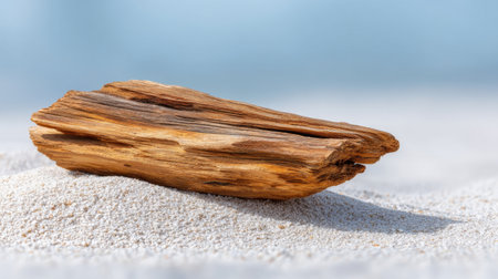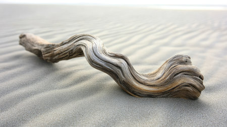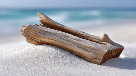 A beautiful piece of driftwood rests on fine sand, highlighting the tranquil essence of nature. The soft colors and textures create a serene beach atmosphere.