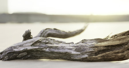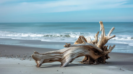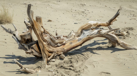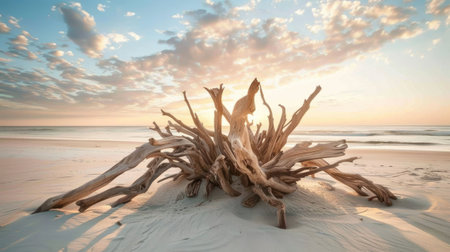Capturing Natures Artistry: Driftwood Sculpture on Sandy Beach - A Stunning 3:2 Snapshot