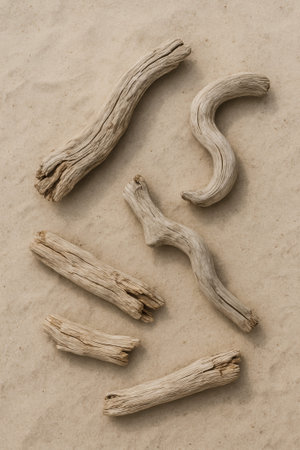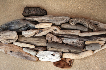 Driftwood arranged on textured surface, showcasing natural wood colors and patterns. unique shapes and tones create organic aesthetic, perfect for decor or artistic projects