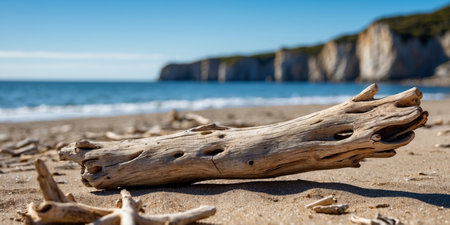 AI Generated. Driftwood on a scenic beach with cliffs in the background under a blue sky