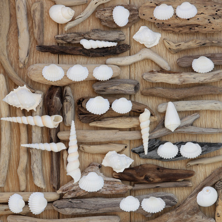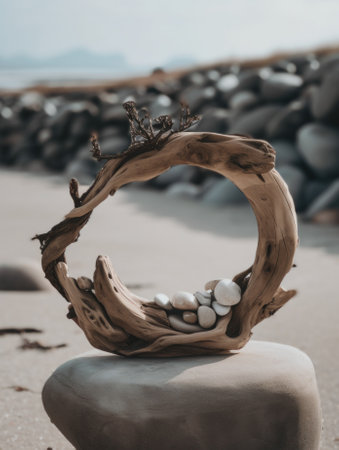 A serene collection of driftwood, shells, and stones, beautifully arranged against a soft backdrop, perfect for design projects and nature-inspired art.