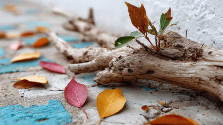 A close-up view of a natural branch adorned with vibrant autumn leaves on a textured surface. This tranquil image captures the essence of nature's beauty.