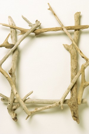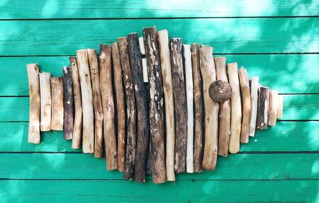 Curves salted sticks, driftwood collected on the beach, on a light background, tied with a rope. Eco