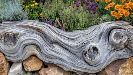A stunning piece of weathered wood artfully arranged amidst vibrant flowers, creating a serene garden scene filled with natural beauty and texture.