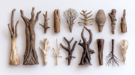 AI Generated. Collection nine different types driftwood branches are of twisted tree