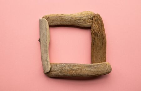 Driftwood frame isolated on a pink background. Rustic driftwood square frame with copy space. Summer driftwood Mockup Wooden frame in beach style