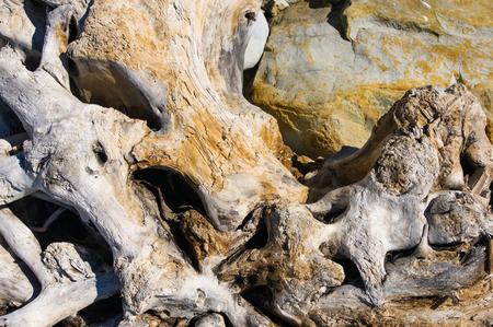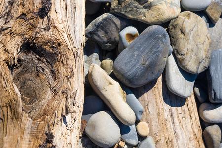 driftwood, washed up by the sea on a pebble beach on a warm summer day