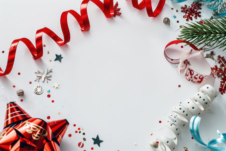Festive holiday decorations featuring variety of colorful ornaments in red, silver, and blue arranged in decorative frame. scene evokes joyful and cheerful atmosphere perfect for celebrations